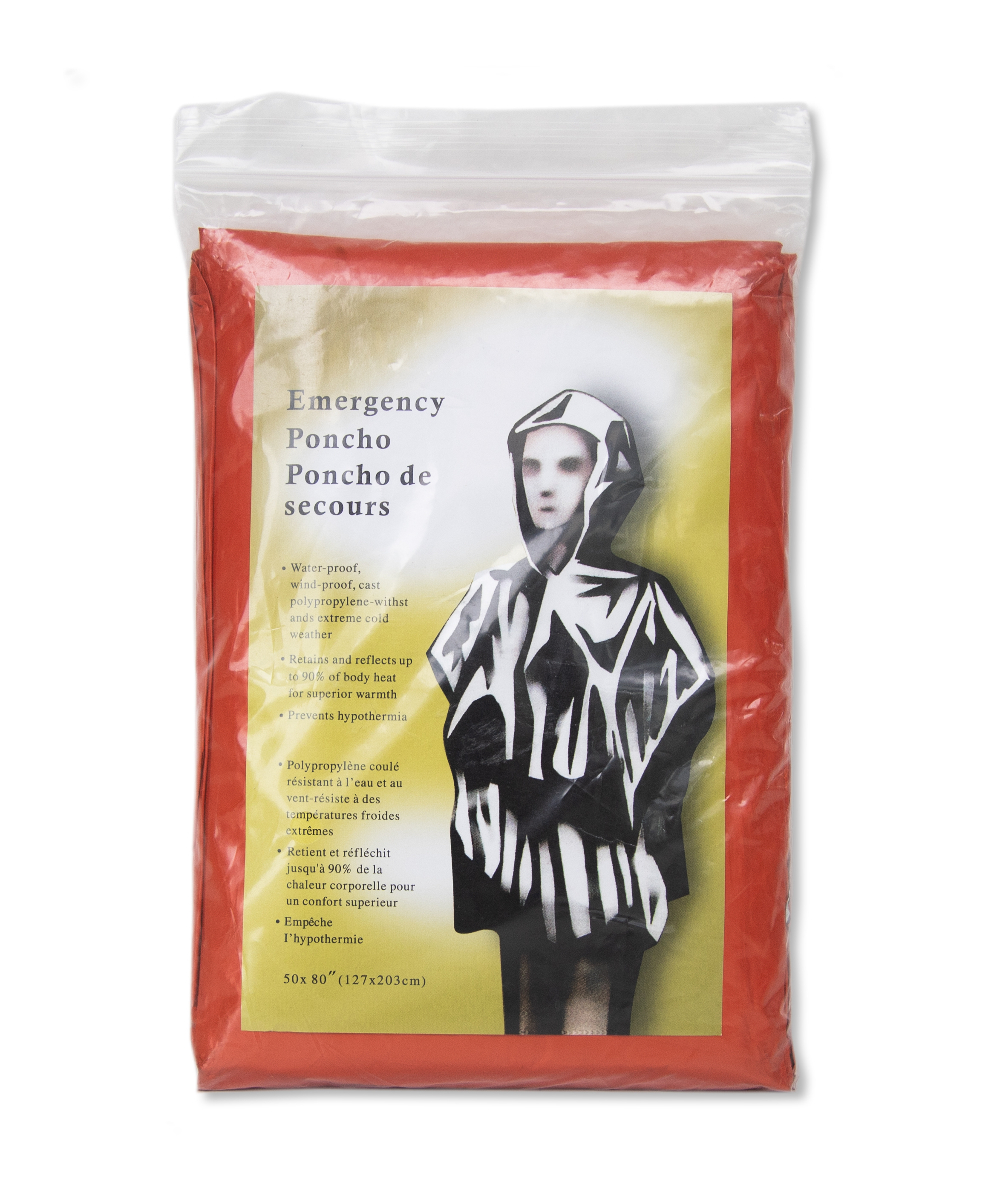- Noodponcho. Om jezelf droog te houden in regenachtige omstandigheden en te beschermen tegen onderkoeling. De binnenkant van de poncho heeft dezelfde isolerende werking als een aluminium deken, waardoor het ook helpt om lichaamswarmte vast te houden.