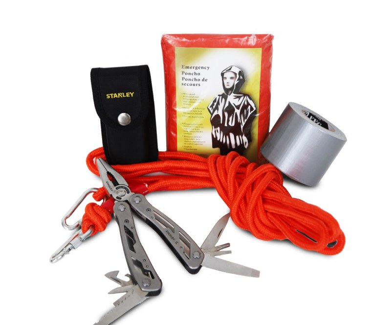 - Veiligheidstouw met 2 metalen haken (5 meter). Dit stevige touw is veelzijdig inzetbaar. Het kan gebruikt worden om je belangrijkse spullen vast te zetten tijdens stormachtige omstandigheden, of om deuren en ramen dicht te houden bij schade of instabiliteit.