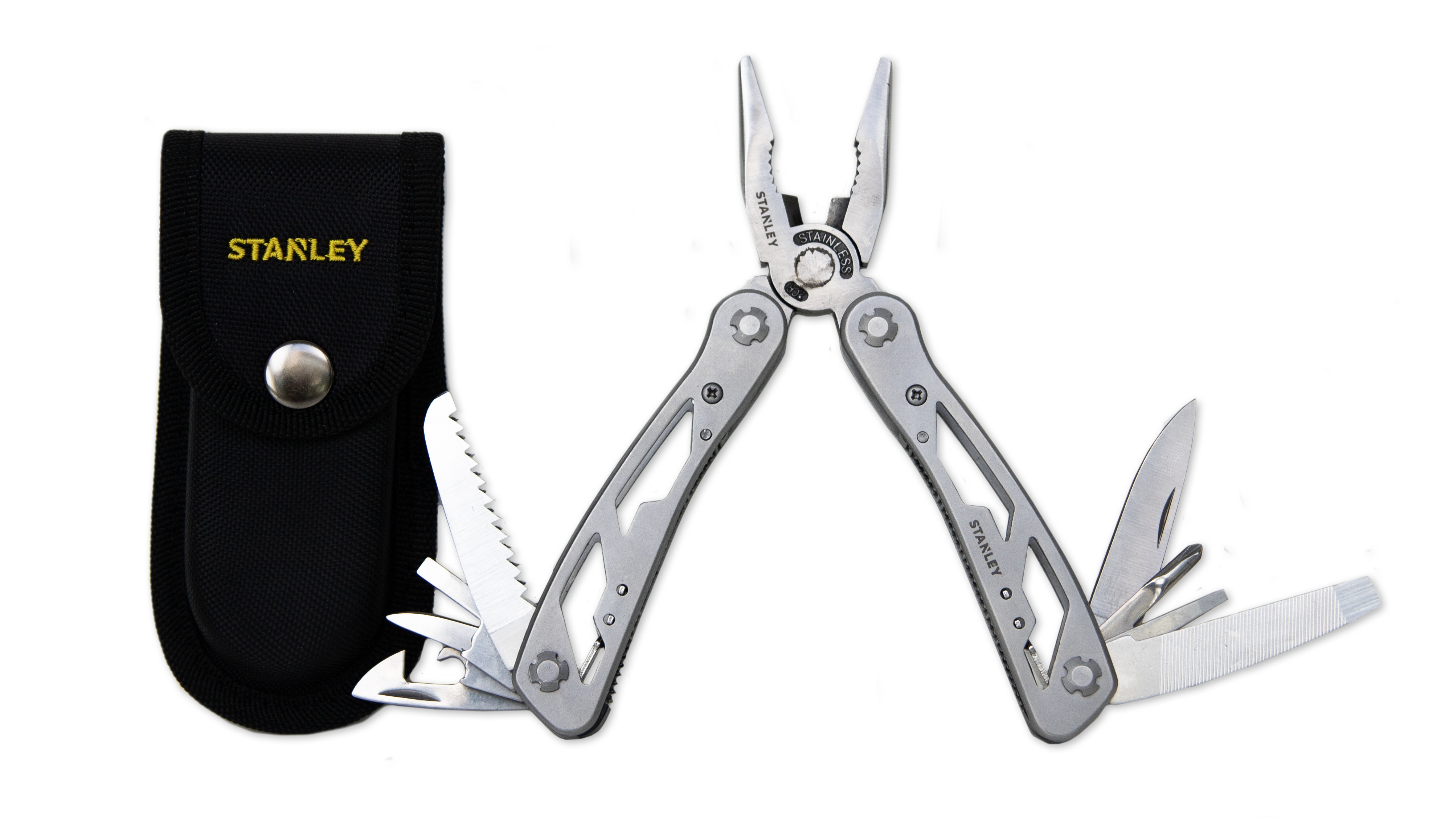 - Stanley Multi Tool 12-in-1, met opbergzakje. Een alles-in-één gereedschap: combinatietang, draadsnijder, zaag, zakmes, groot mes, flesopener, schroevendraaier 3mm / 6mm / 8mm / PH1, vijl.