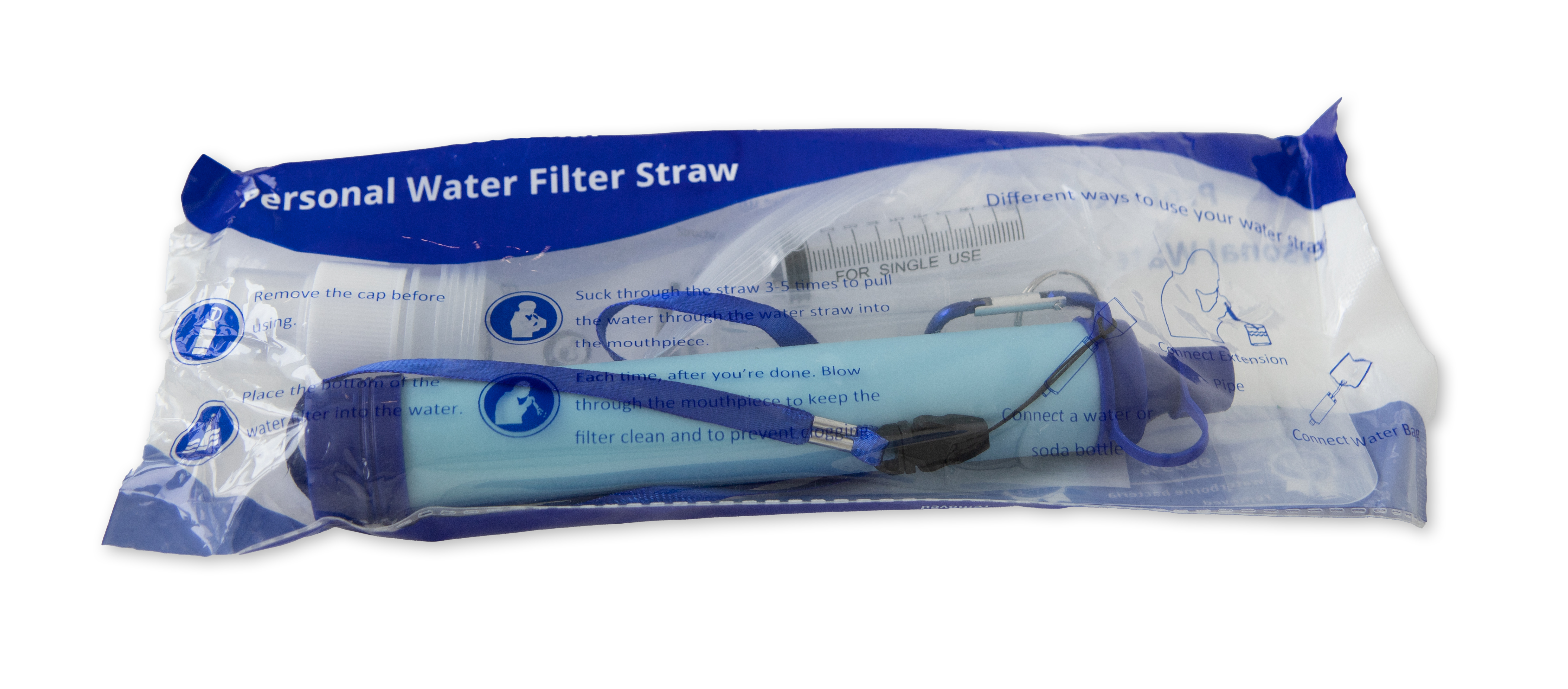 - Waterfilter: kan tot 1.500 liter filteren. In noodsituaties waar toegang tot schoon water beperkt is, kan de filter je voorzien van drinkwater door onzuiverheden en verontreinigingen uit het water te verwijderen.
