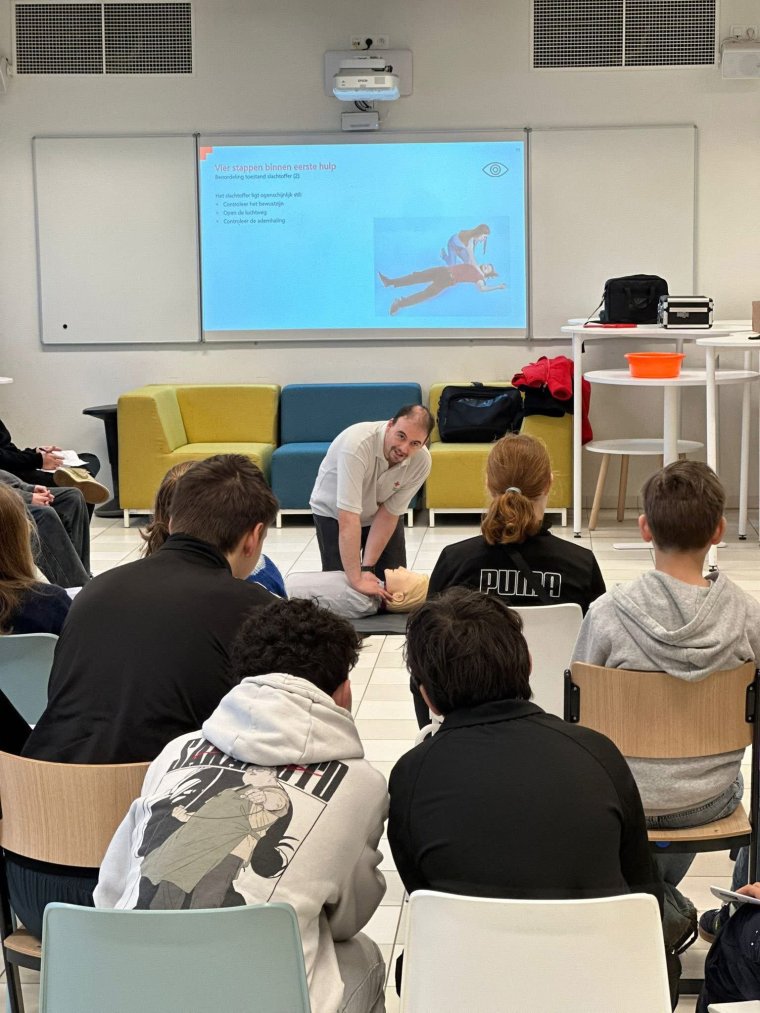 Vandaag zijn we te vinden in de Middenschool Bredene om les te geven rond eerste hulp. Lesgever Sven van Rode Kruis Bredene en lesgever Jurgen van Rode Kruis-Hinterland leggen alles duidelijk en stap voor stap uit zodat de leerlingen een goede basis meekrijgen. Bedankt aan de leerlingen voor hun aandacht en enthousiasme, en aan de school voor de fijne samenwerking!