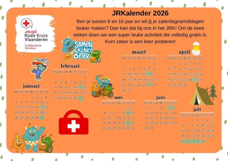 Hier vind je de kalender van 2026. Wil je deelnemen aan onze activiteiten stuur even een mailtje naar Jeugd@grobbendonk-vorselaar.rodekruis.be