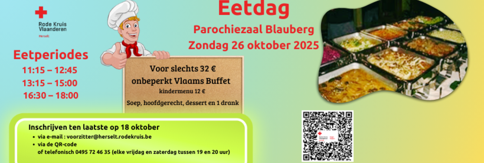 Onze Rode Kruisafdeling staat klaar om jou te helpen! Samen met mensen uit de buurt zetten we onze schouders onder verschillende projecten: van bloedinzamelingen tot eerste hulp aanleren of zorgeloos evenementen organiseren. Op 26 oktober organiseren we weer onze jaarlijkse eetdag. Schrijf nu in