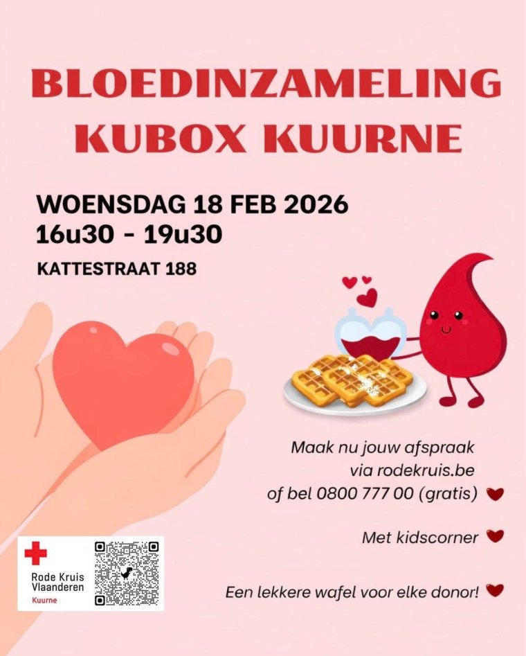 Op 18 februari kan je tussen 16u30 en 19u30 terecht in de Kubox om bloed te doneren! Bovendien krijgt elke bloeddonor een gratis wafel! Kinderen kunnen zich ondertussen uitleven in de kinderhoek uitgebaat door Jeugd Rode Kruis.