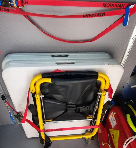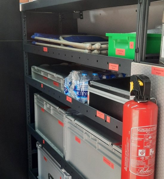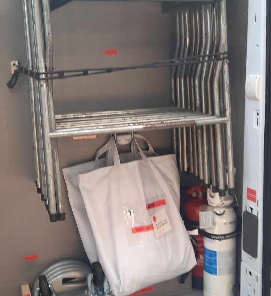 De rekken zijn modulair en dus verstelbaar aan onze koffers en hulpdienstmaterialen. Dat zijn o.a. verzorgingskoffers, hulptassen, parametermateriaal, onze nieuwe tenten ( aangekocht in 2025 met opbrengst van de pleisterverkoop 2025), brancards, onderstellen voor brancards enz ...