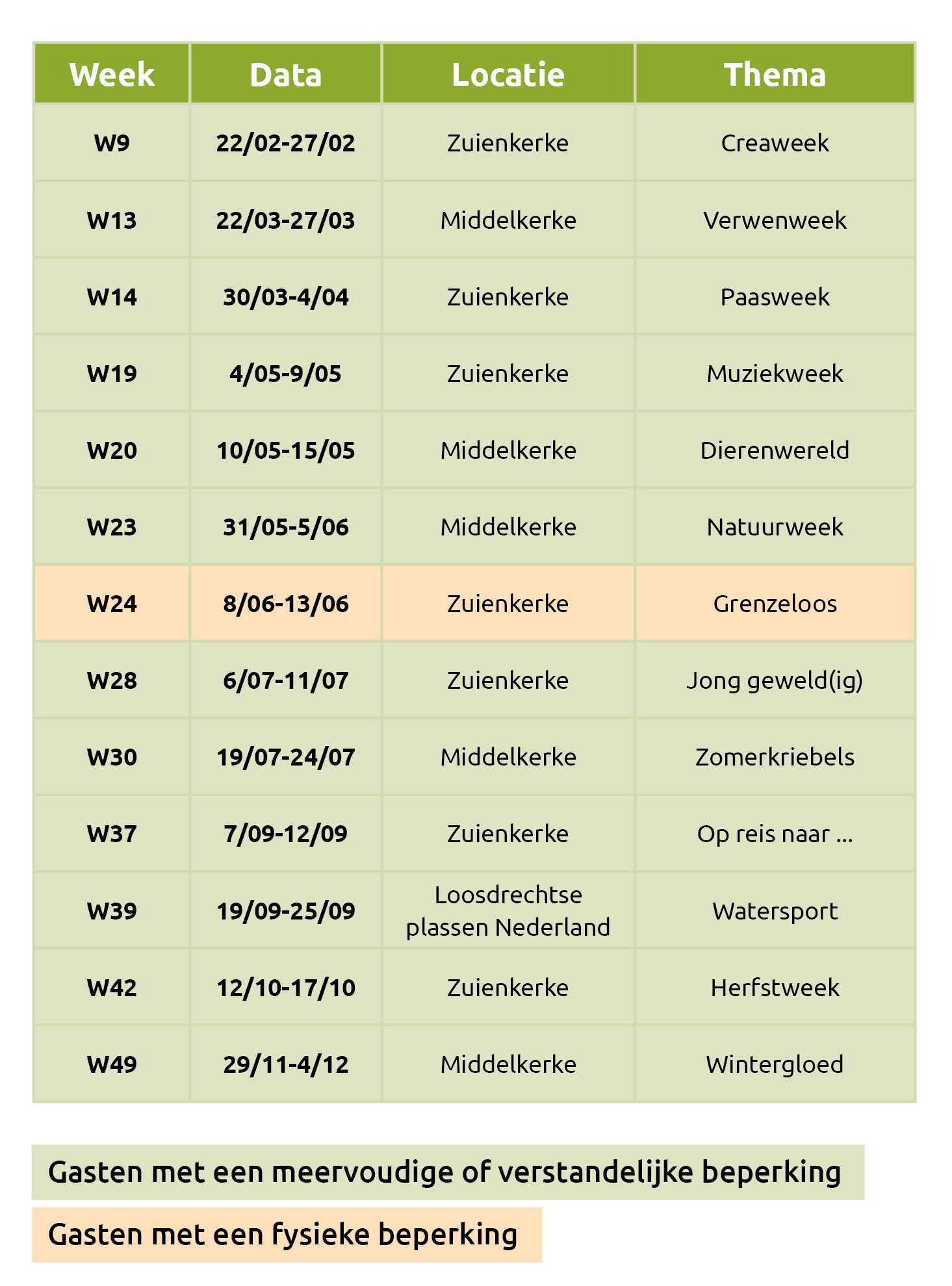 De WOW vakanties in oranje zijn voor mensen met een fysieke beperking en de WOW vakanties in het groen voor mensen met een meervoudige of mentale beperking.